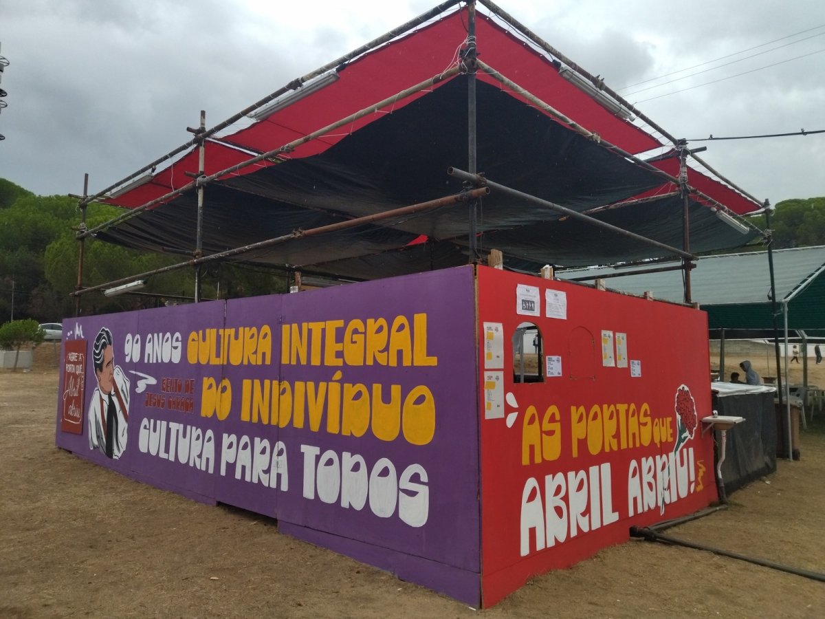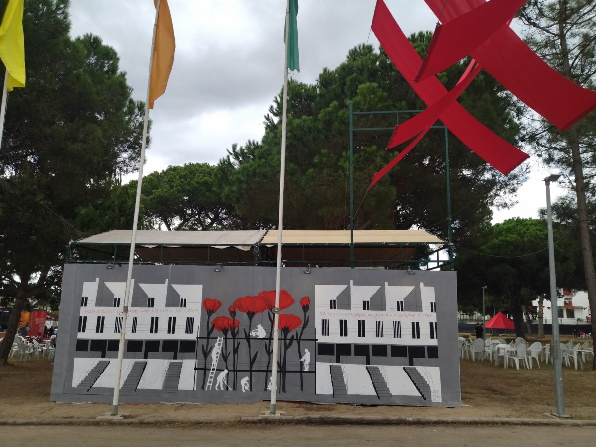 Na Festa do Avante! de 2023 terão sido centenas as pessoas que conceberam, desenharam e pintaram as largas dezenas de murais presentes no recinto. Com expressões visuais muito distintas, ao longo das últimas semanas de construção da festa multiplicaram-se as projecções dos desenhos nas paredes à noite, muitas vezes adaptados no momento ao espaço específico, exigindo alterações aos projectos. Assim como proliferaram os pequenos agrupamentos junto às paredes durante o dia, com rolos, pincéis, esponjas, latas de tinta de vários tamanhos, escadotes e outras ferramentas utilizadas para a pintura. Tal como acontece em todas as outras tarefas de construção da Festa do Avante!, esses agrupamentos têm na sua composição artistas, professores, carpinteiros, empregados de escritório, da limpeza, estudantes, investigadores, operários, operadores de caixa de supermercado. E é extraordinário que assim seja. A sabedoria, a experiência, a criatividade, a imaginação, a precisão, o rigor e a técnica são partilhados e durante as horas em que alguém integra determinada tarefa é o que ela exigir – carpinteiro, mecânico, motorista, varredor, pedreiro, jardineiro, artista.