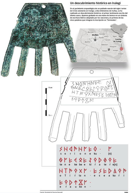 Na lâmina de bronze com forma de mão, Javier Velaza, especialista em epigrafia da Universidade de Barcelona, e Joaquín Gorrochategui, linguista da Universidade do País Basco, encontraram cinco palavras inscritas, das quais apenas uma foi decifrada ou traduzida: «sorioneku (zorioneko)».