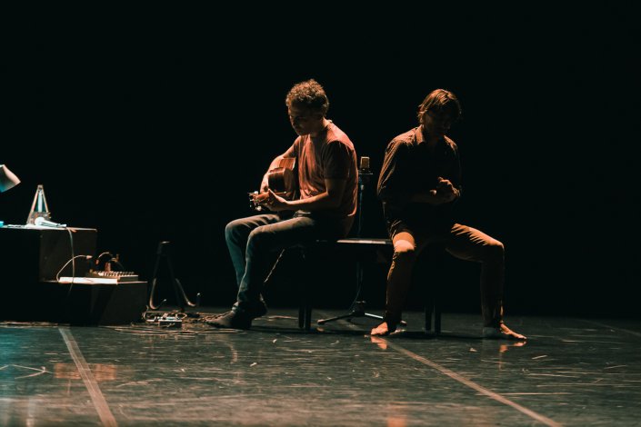 Em palco, «um bailarino e um músico interrogam a sua condição presente numa partilha crua entre eles e o público, onde o confronto e inconformismo são a ignição para o bailado dos corpos numa peça performativa que cruza o movimento coreografado com som puro, por vezes rasgado, de uma guitarra, num ambiente intenso, intimista e inquietante», explica a nota de apresentação do espectáculo.