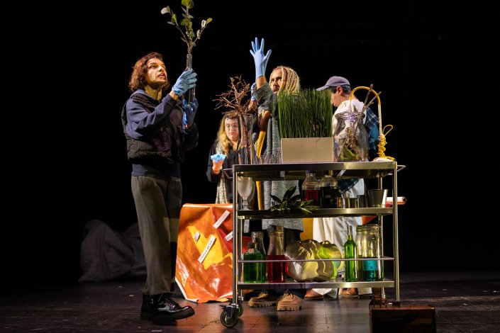 Alice Azevedo, Bruno Huca, Carla Bolito e Diogo Freitas são os quatro sobreviventes de um mundo a colapsar, «incluindo uma nova espécie de ser humano, fruto de um projecto laboratorial, destinada a repovoar a terra e desenhada geneticamente segundo uma ética do cuidado, com valores essenciais de empatia e de atenção à vulnerabilidade», lê-se na sinopse. Em conjunto, acrescenta, as personagens tentam reabilitar o mundo ou «sonhá-lo de maneira a viverem o melhor possível».