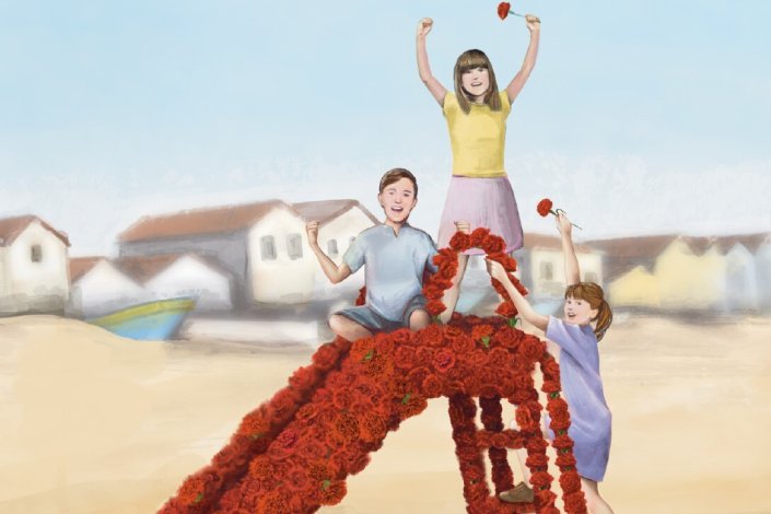 Num Abril e Fechar de Olhos conta a história de três crianças, que, no início dos anos 70, decidem lutar pelo direito a um parque infantil. «Nesta jornada os três amigos vão conhecer vários habitantes da aldeia, e confrontar-se com realidades, que apesar de lhes serem próximas, não conheciam», lê-se na sinopse do trabalho, da autoria de Mafalda Santos.