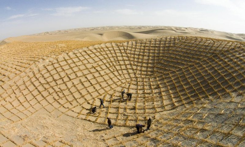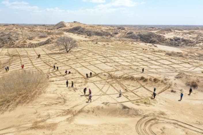 De acordo com Zhang Peiji, vice-diretor do Gabinete de Silvicultura e Pradarias de Pishan, as dunas de uma parte do distrito estão bastante espaçadas, e as tradicionais barreiras de palha (estratégia que consiste em colocar a palha num padrão axadrezado na superfície do deserto para fixar as dunas) são facilmente soterrados pela areia mutável.