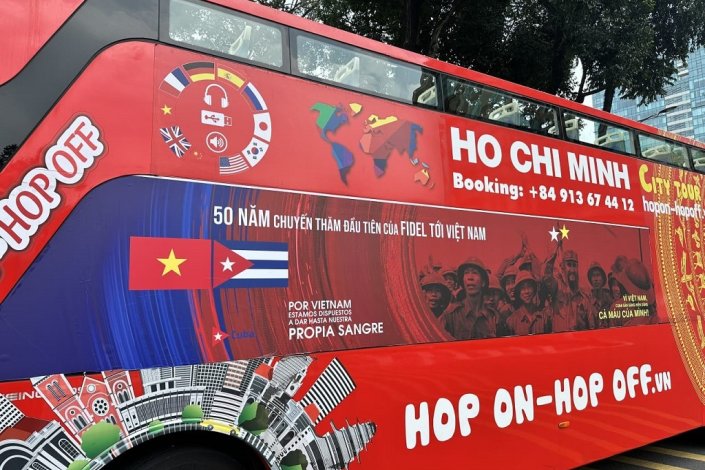 O cartaz, colocado na parte lateral de um autocarro turístico, reproduz a histórica fotografia de Fidel a erguer a bandeira da Frente de Libertação Nacional do Vietname do Sul na Colina 241 (na comuna de Cam Chinh, distrito de Cam Lo).