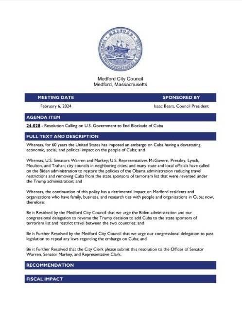 Neste contexto, o Conselho Municipal de Medford pede aos congressistas do estado de Massachusetts que «aprovem legislação para revogar quaisquer leis relativas ao embargo a Cuba».