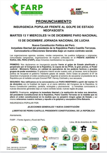 Num comunicado emitido esta segunda-feira, a Confederação Geral dos Trabalhadores do Peru (CGTP) condena a repressão da «ditadura cívico-militar», que, explica, foi formada pelo governo de Dina Boluarte, apoiado por sectores extremistas do Congresso, das Forças Armadas e da Polícia, com o beneplácito da oligarquia e do poder mediático.