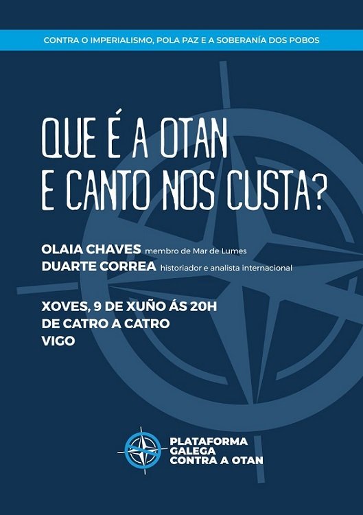 A iniciativa da próxima quinta-feira, em Vigo, parte da Plataforma Galega contra a OTAN – contra o imperialismo, pola paz e a soberanía dos pobos.