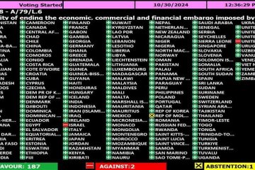 Díaz-Canel notou ainda que, «à sua política de bloqueio contra o povo nobre e solidário de Cuba, o governo norte-americano junta uma infâmia adicional: faz-se acompanhar outra vez no voto negativo por Israel, o genocida de Gaza. Vergonhoso e duplo prontuário criminoso».