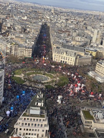 Só em Paris, manifestaram-se meio milhão de pessoas (87 mil de acordo com a Polícia), numa marcha entre a Praça de Itália e os Inválidos em que se viram balões gigantes, faixas e cartazes a dar expressão à grande rejeição que o projecto de reforma do governo, que altera a idade legal de reforma dos 62 para os 64 anos, suscita no país.