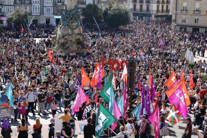 Ao final da tarde, repetiram-se as manifestações nas capitais e em muitas outras localidades bascas – 85 no total –, nas quais voltaram a ficar patentes as reivindicações de um salário mínimo de 1500 euros e de aumentos salariais generalizados, bem como a denúncia da precariedade, a defesa do aumento das pensões de reforma, da melhoria das condições de vida dos jovens, das mulheres e dos migrantes, indica o portal naiz.eus.