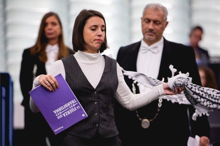 As deputadas em questão eram a Irene Montero e a Rima Hassan, que se preparavam para realizar uma intervenção, fazendo-se acompanhar de um keffiyeh, um lenço associado à resistência palestiniana contra a agressão e ocupação do Estado sionista de Israel.