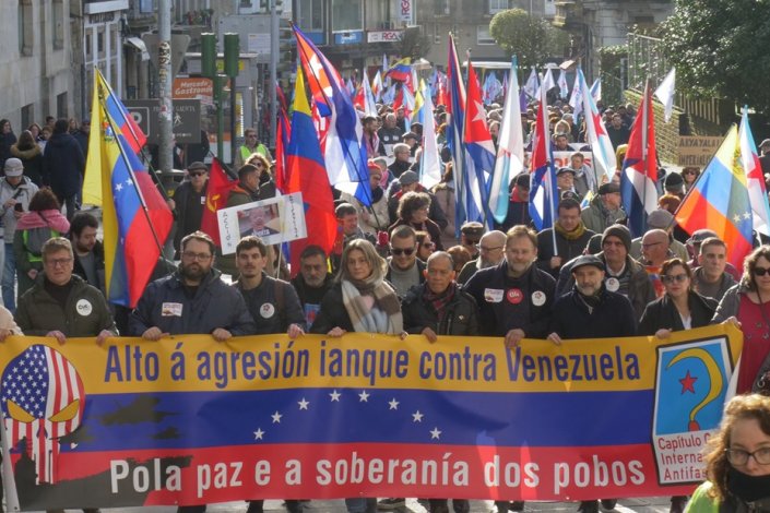 Convocada pela Asociación Galego-Bolivariana Hugo Chávez (AGABO) e mais duas dezenas de organizações políticas, sociais e sindicais, sob o lema «Non ás agresións ianquis a Venezuela, pola paz e a soberanía dos pobos», a manifestação percorreu, este sábado, as principais ruas de Santiago de Compostela, com o intuito de «transmitir uma mensagem de solidariedade e de apoio ao povo venezuelano que resiste aos ataques do imperialismo norte-americano».