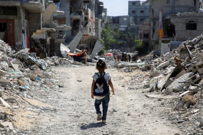 Uma jovem estudante palestiniana caminha por entre os escombros em Khan Younis, no Sul da Faixa de Gaza (imagem de arquivo) Créditos / PressTV