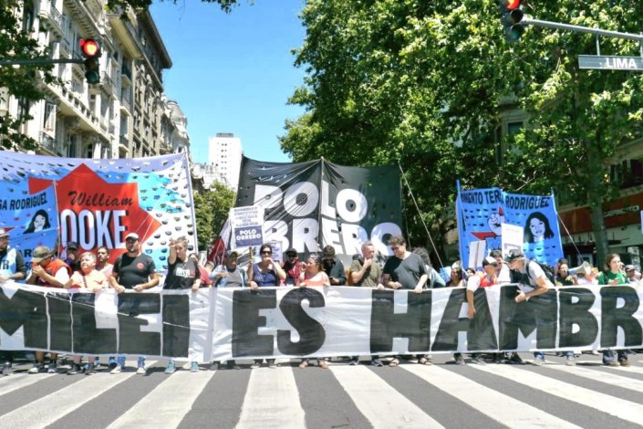 A manifestação prolongou-se por várias horas no centro de Buenos Aires, desde o Congresso Nacional até à sede do Ministério do Capital Humano, com os participantes atrás de uma grande faixa em que se lia «Milei é fome».