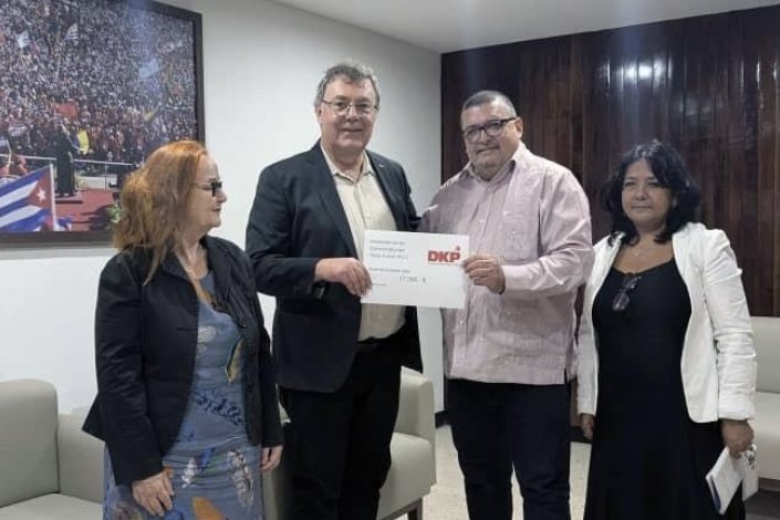 Patrik Köbele, presidente do DKP, entrega uma doação a representantes do Partido Comunista de Cuba (PCC) em Havana Créditos / PCC / Peoples Dispatch