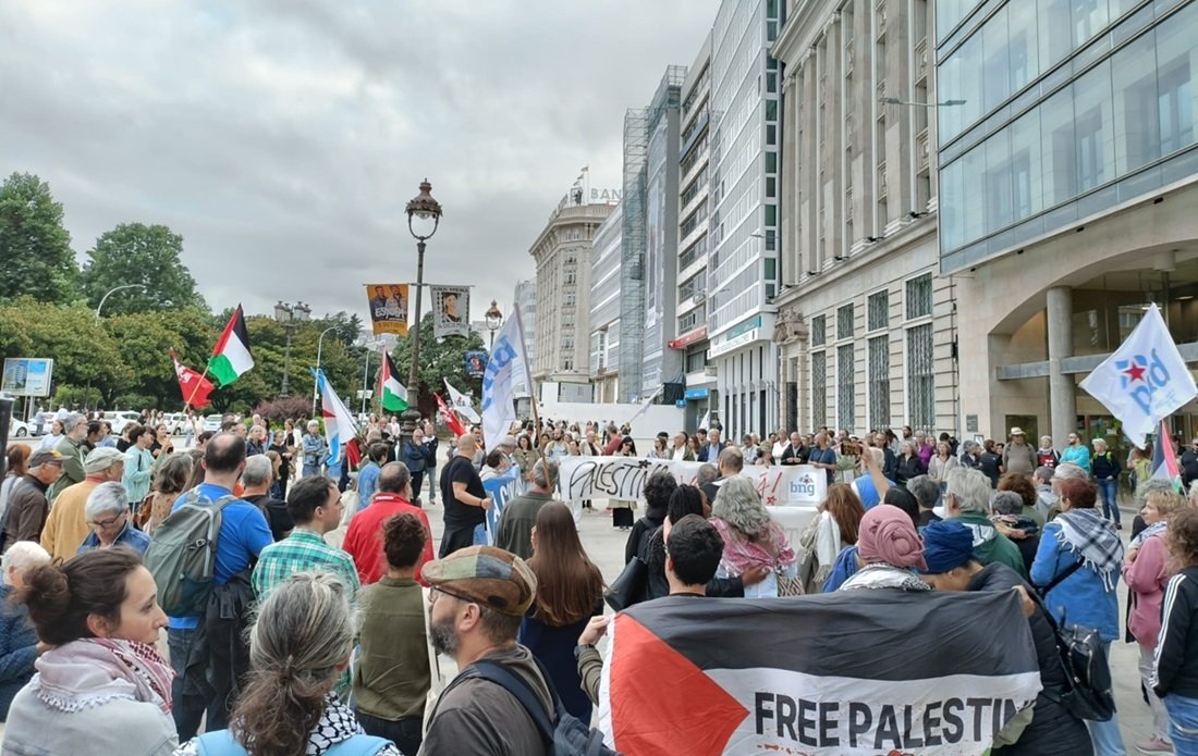 Centenas de pessoas participaram na jornada de mobilização que, esta segunda-feira, se plasmou em cidades e vilas da Galiza, em solidariedade com o povo palestiniano e para denunciar o genocídio que as forças de ocupação israelitas estão a cometer na Faixa de Gaza.