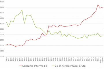 Em Portugal, a situação da agricultura pode ser resumida em traços largos a partir do gráfico da Figura 1. Desde os anos 80 que a produção (Valor Acrescentado Bruto) tem vindo a baixar, primeiro, de forma acentuada nos primeiros anos de adesão de Portugal à então CEE, e depois entrando numa estagnação que perdura até hoje. Paralelamente a este processo, os consumos intermédios (energia, adubos, rações etc.) cresceram ininterruptamente durante todo o período, até hoje. Não fossem os apoios comunitários que representam entre 20 e 30% do seu rendimento (em média na UE, segundo dados da Comissão Europeia), grande parte das explorações já teria fechado as portas. As novas regras da PAC, que entraram em vigor em 2023, introduziram novas exigências em matéria ambiental, mas sem acautelar as necessárias compensações para fazer face aos encargos suplementares. Pior, a implementação do chamado PEPAC (Plano Estratégico da PAC para Portugal) levou a um corte significativo dos apoios à produção da ordem dos 47% de acordo com a primeira estimativa das contas económicas de 2023 do INE!