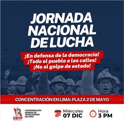 A Confederação Geral dos Trabalhadores do Peru (CGTP), que integra a ANP, anunciou que «a classe trabalhadora e o povo se mobilizam a nível nacional em defesa da democracia, contra o golpe de Estado promovido pelos grupos de poder económico». Na capital, Lima, a concentração terá lugafr na Praça 2 de Maio, às 15h (20h em Portugal continental e Região Autónoma da Madeira).