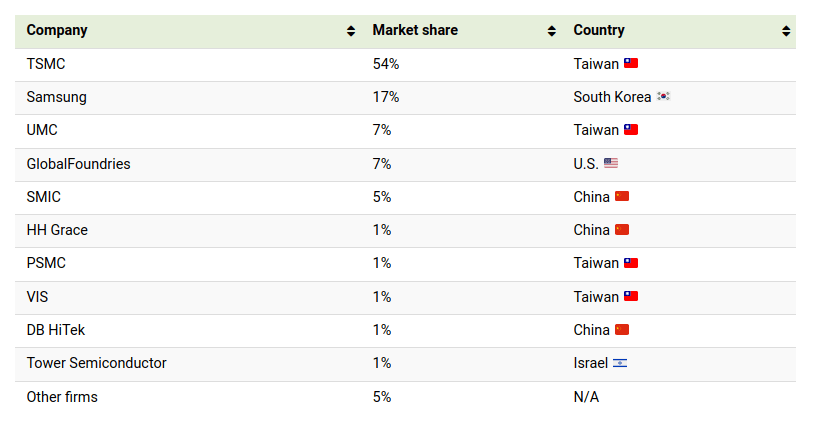 A TSMC poderia ser uma mera empresa taiwanesa, mas a sua importância global, pouco conhecida, fazem dela uma prioridade para os EUA, uma vez que dominan 54% do mercado global de semiconductores, segundo o site Visual Capitalist (Quadro 1). Os EUA, por exemplo, só controlam 7% do mercado. De acordo com a Forture, a TSMC vale 426 mil milhões de dolares.