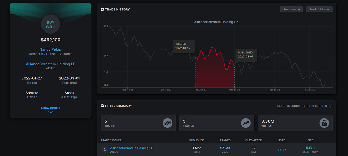 A notícia podia não dizer absolutamente nada, nem ter relação com os chamados «actores políticos», mas a verdade é que nesse mesmo ano surge a discussão sobre a proibição da venda e troca de acções por parte dos membros do Congresso. Alegava-se que os congressista poderiam aproveitar-se da sua condição e de informações privilegiadas para fazer negócios, levantando questões éticas. Nessa altura, Pelosi, de olho nos seus próprios interesses, acabou por se opor à ideia dizendo: «Vivemos numa sociedade de mercado livre. Eles [os congressistas] devem poder participar nele». As declarações de Nancy Pelosi foram proferidas em Dezembro de 2021; a 27 de Janeiro de 2022 dá o passo e adquire acções da AllianceBernstein Holdings.