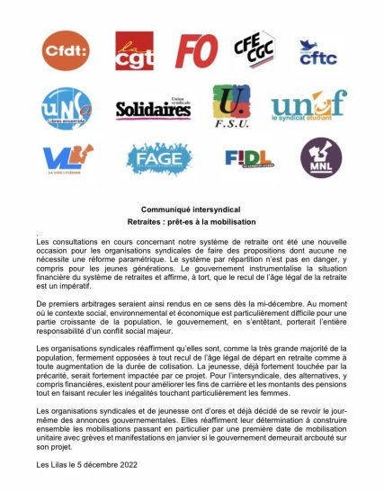 Num comunicado emitido esta segunda-feira, após uma reunião na sede da FSU em Lilas (Paris), não é referida uma data concreta de mobilização ou para o início dos protestos, mas aponta-se a possibilidade de uma jornada de luta unitária, com greves e manifestações, em Janeiro de 2023.