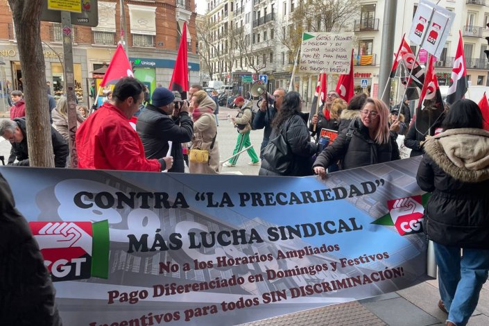A mobilização, no primeiro dia de saldos, foi convocada pelo sindicato CGT e teve lugar frente à loja da Rua Goya, para denunciar as condições de trabalho durante a campanha de Natal e exigir melhorias.