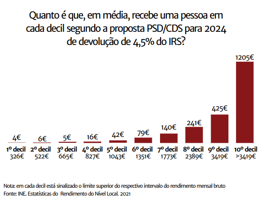 Que se veja o quadro abaixo para ver quanto é que, em média, recebe uma pessoa em cada decil segundo a proposta PSD/CDS para 2024 de devolução de 4,5% do IRS. Enquanto uma pessoa que no primeiro decil recebe, em média 326 euros de rendimento mensal bruto, irá ver devolvido apenas 4 euros. O mesmo não se pode dizer de uma pessoa que esteja no décimo decil, já que com um rendimento médio de mais de 3419 euros, irá  ser devolvido 1025 euros.