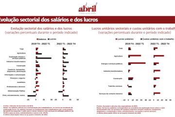 No segundo quadro, onde se observam os lucros unitários sectoriais e custos unitários com o trabalho vemos ainda que, mais uma vez, a tendência é semelhante. O ano de 2022 revela que os custos com o trabalho não acompanharam a tendência de subida dos lucros. Se no período relativo ao quarto trimestre de 2019 e ao primeiro trimestre de 2022 até se podia considerar que os custos com o trabalho eram maiores que os lucros, atendendo até aos efeitos da pandemia, sendo que a discrepância não era grande, o ano de 2022 alterou por completo essa tendência.