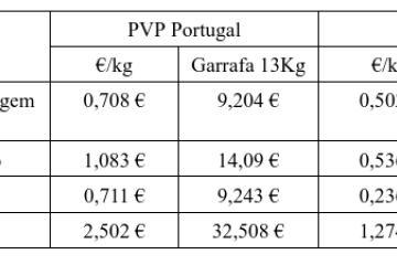Que aprendemos? Que o grosso da diferença está nas margens de Retalho+Comercialização. Mas algo justifica que os custos de retalho e distribuição sejam mais do dobro dos custos em Espanha? Só as margens de lucro demasiado grandes. Não é aceitável que o custo do retalho e comercialização sejam 153% do custo de produção. É caso para perguntar... que tem a guerra na Ucrânia ou na Palestina a ver com as margens de comercialização e de retalho em Portugal? Directamente, nada, certo? Ora aqui só há uma solução: colocar um preço máximo às margens de comercialização e distribuição, aplicadas sobre o preço de saída após o enchimento. apontemos para um valor similar ao praticado em Espanha. Admitamos 0,6€ por quilo, 7,8€ por garrafa.