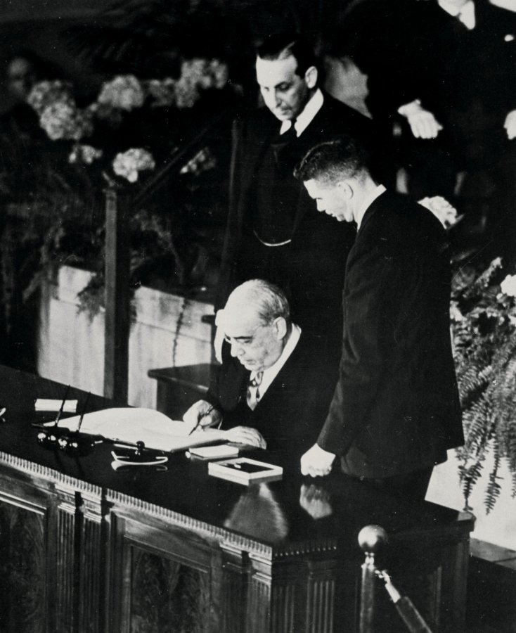 A NATO nasceu sem horror político ao fascismo, como ficou provado pela presença do Portugal de Salazar entre os fundadores. Nasceu também sem horror militar ao nazismo, afirmação que pode ser chocante, mas a realidade confirma. (continuação) Quatro dos considerados «pais fundadores» do processo de integração que conduziu à União Europeia foram subscritores do Pacto do Atlântico, uma significativa geminação essencial para concretizar a satelitização da Europa como uma estratégia de fundo do poder imperial dos Estados Unidos da América. Paul-Henri Spaak, ministro dos Negócios Estrangeiros da Bélgica, depois primeiro-ministro, ficou conhecido como «senhor Europa» pelo seu envolvimento persistente na criação de instituições para a integração europeia, designadamente o Tratado de Roma de 1957, e pelo apego à fundação da NATO, de que acabou por ser secretário-geral de 1957 a 1961. A sobreposição da evolução da NATO e do processo de integração europeia está sempre presente na actuação deste dirigente socialista belga, que foi igualmente o primeiro presidente da Assembleia Geral da ONU. Em Washington, Spaak deixou a mensagem canónica sobre as necessidades «defensivas» da inocente civilização ocidental: «o novo pacto não é contra ninguém, não ameaça ninguém a não ser, naturalmente, qualquer pessoa ou pessoas que possam fomentar a ideia criminosa de recorrer à guerra». Robert Schuman, designado «pai da Europa» a par do seu compatriota Jean Monet, ambos defendendo a criação de uns Estados Unidos da Europa, fazendo uso abusivo e descontextualizado da ideia expressada um século antes por Victor Hugo, foi o representante da França em Washington. Proferiu uma declaração piedosa de que «a salvação das nações não pode basear-se num nacionalismo egoísta mas deve apoiar-se na aplicação progressiva da solidariedade humana». Ou seja, tudo quanto a NATO e a União Europeia são hoje, dissolvendo a soberania das nações em vez de as «salvar», armando e militarizando a «solidariedade humana». O seu discurso de 9 de Maio de 1950, conhecido como a «Declaração Schuman», é considerado pela autarcia de Bruxelas como o acto de fundação da União Europeia. «Robert Schuman, designado "pai da Europa" a par do seu compatriota Jean Monet, ambos defendendo a criação de uns Estados Unidos da Europa, fazendo uso abusivo e descontextualizado da ideia expressada um século antes por Victor Hugo, foi o representante da França em Washington.» Dirk U. Stikker, banqueiro e industrial em funções de ministro dos Negócios Estrangeiros da Holanda, subscreveu a fundação da NATO enaltecendo que «finalmente prevalece a verdade de que o Atlântico Norte é uma auto-estrada que une, não uma barreira que divide. Regozijemo-nos», acrescentou, «com o pensamento de que os norte-americanos e os europeus ocidentais se encontraram num edifício comum dedicado à paz». Considerado demasiado pró-norte-americano, mesmo pelos padrões da NATO, este dedicado defensor da actuação conjunta da aliança com a Comunidade Europeia do Carvão e do Aço, um embrião da União Europeia, falhou a primeira tentativa para ser nomeado secretário-geral atlantista, cargo que acabou por desempenhar entre 1961 e 1964. Joseph Bech, que como refugiado político durante a Segunda Guerra Mundial escolheu o Portugal de Salazar como seu primeiro lugar de exílio, foi o representante do Luxemburgo em Washington. É considerado um dos «pais fundadores» da integração europeia, depois de ter patrocinado a constituição do Benelux – Bélgica, Holanda e Luxemburgo. Segundo o então ministro dos Negócios Estrangeiros luxemburguês, «os Estados signatários do Pacto do Atlântico constituem ao mesmo tempo a mais formidável e mais sinceramente pacífica coligação de forças materiais e morais que já foi criada pelas nações para garantir a sua segurança e poupar o mundo aos horrores da guerra». Perdeu-se um meritório escritor de ficção. A NATO proclama-se em permanente cruzada pela democracia, atribuindo-se até o direito de invadir países para implantar um regime político que obedeça às suas exigências e onde as eleições dêem sempre os resultados por ela pretendidos. «A adesão à Aliança significou um maior prestígio e o reforço do estatuto de Portugal no seu conjunto. Também injectou um grau de estabilidade na frente doméstica». (Site oficial da NATO sobre a presença do Portugal de Salazar na fundação da organização) Passaram os anos, exactamente três quartos de século, e a NATO da actualidade mantém-se uma fiel respeitadora dos mitos fundadores, actualizados por uma dinâmica propagandística que sempre esteve na base da sua actuação mas adquiriu hoje uma amadurecida sofisticação de mensagem e meios, além de uma capacidade de controlo totalitário quase absoluto da opinião pública ocidental. O que lhe permite praticar abertamente, e sempre a coberto da proclamação das melhores intenções, a política belicista, expansionista e colonial-imperial que determinou a sua criação. Asseguraram os fundadores da NATO, entre os quais, com papel determinante, os estrategos da integração europeia – sempre sob a tutela dos Estados Unidos da América – que a aliança nascia como organização «defensiva» para se precaver contra as ameaças de grande envergadura, existentes naquele pós-guerra, visando a civilização ocidental, os seus valores humanistas e matriz religiosa. Essa tarefa deveria assentar numa convergência de práticas políticas, princípios de liberdade, harmonia dos sistemas económicos, integração dos aparelhos militares, tudo isso para cultivar e assegurar a paz no mundo. Não é um equívoco: a NATO de então, e de sempre, que durante sete décadas e meia se dedicou a uma estratégia de terror e provocação durante a guerra fria, que actualmente se desmultiplica em guerras sem fim, que tem nos seus activ