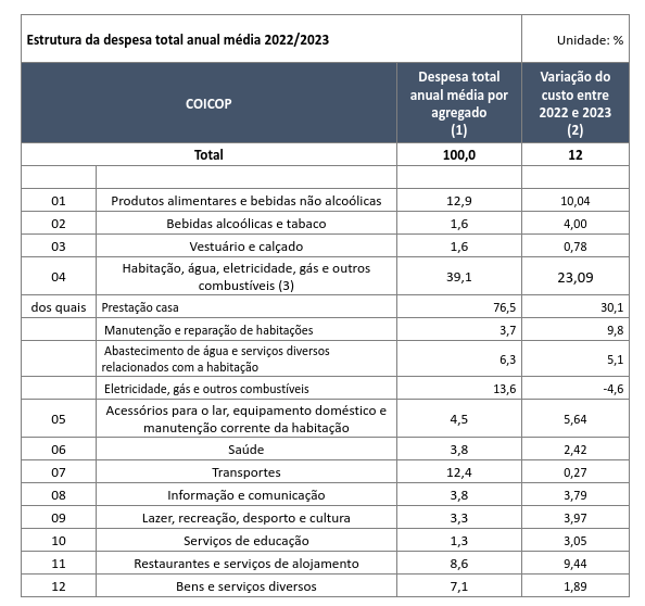 Nota: (1) Para a coluna da «Despesa total anual média por agregado», utilizámos os dados do Inquérito às Despesas das Famílias 2022\2023, tendo por nós sido apurado, com base nos dados fornecidos, o peso relativo de cada componente no total da «Habitação, água, electricidade, gás e outros componentes».