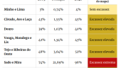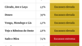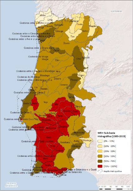 A «escassez» é apresentada pelo WEI+ , que designam por «índice de escassez», no mapa e na tabela seguintes.