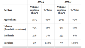 Note-se que o «volume a captar» em 2040 é pouco mais de metade das «necessidades» avaliadas no PNA de 2000; e que a captação prevista para agricultura é 4093 hm3 versus 6500 de captação real e 8732 «necessários» em 2000. Isto, apesar de fomentar o aumento de muito grandes regadios, o que só pode significar que programa acabar de vez com as pequenas e médias explorações agrícolas.