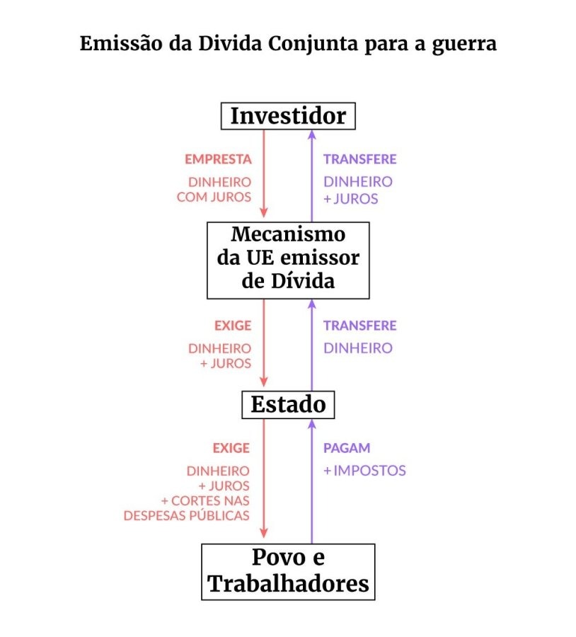 Segundo a Agência Lusa, a justificação para tal ideia perversa, diz a AD, é não «sobrecarregar o orçamento plurianual da União Europeia». Já para o PS é uma forma de «lidar com os diversos desafios comuns». Para o Livre «é um passo que deve ser ponderado». Em última análise, todas as expressões e considerações do que é uma emissão de dívida conjunta, apenas significam continuar a trilhar o caminho que tem levado a milhares de mortes e hipotecar as funções sociais do Estado.