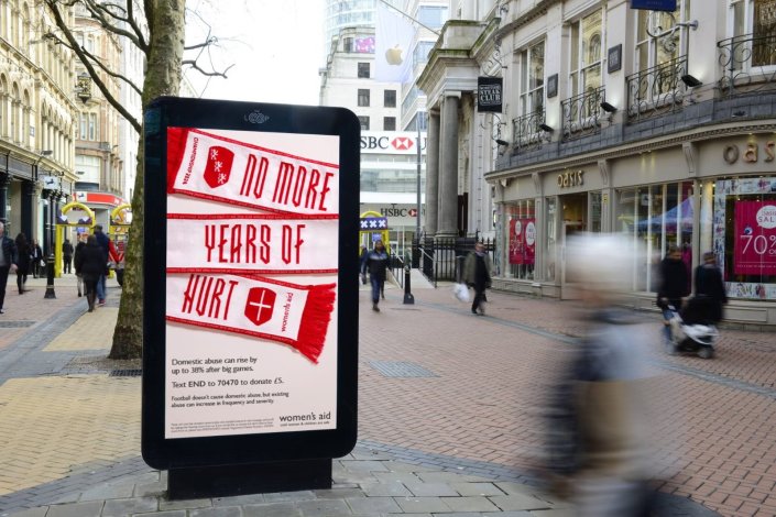 Durante o Campeonato Europeu de futebol masculino de 2024, uma competição que fomenta uma identidade comum entre todos os adeptos de futebol dos diferentes países participantes, diversas associações inglesas de protecção de mulheres vítimas de violência, como a Trevi ou a Next Chapter, lançaram campanhas para aumentar a consciência sobre o crescimento de agressões e outros crimes que as mulheres sofrem durante estas competições às mãos dos seus parceiros. Também em Portugal, a Associação Portuguesa de Apoio à Vítima fez uma parceria com o Futebol Clube do Porto, em 2024, com o lançamento de uma camisola sob o lema «O roxo é para vestir e não para marcar», em véspera do Dia Internacional para a Eliminação da Violência contra as Mulheres.