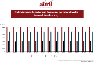 Ou seja, em Maio, o endividamento do sector não financeiro (administrações públicas, empresas e particulares) passou a fixar-se nos 804,4 mil milhões de euros e destes 440,6 mil milhões de euros dizem respeito ao sector privado (empresas privadas e particulares) e 363,9 mil milhões de euros ao sector público (administrações públicas e empresas públicas).