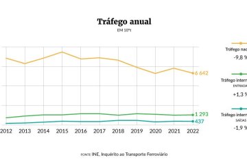 De acordo com a AMT, a taxa de uso média era de 1,41€ Ckm em 2014, no ano que antecedeu a privatização da CP Carga. E 10 anos depois, em 2023, era menor (1,39€ Ckm). Ora, nesse período, em que a taxa esteve congelada na prática, o peso do transporte ferroviário de mercadorias esteve igualmente congelado. Ao contrário do que aconteceu nos anos anteriores à privatização, onde esse peso aumentou consistentemente.