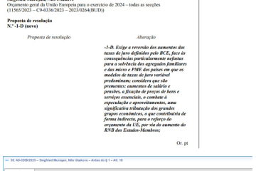Veja-se que em Outubro de 2023, o PCP apresentou uma proposta de alteração à resolução da proposta de orçamento geral da União Europeia de 2024. Propuseram os comunistas o seguinte: «Exige a reversão dos aumentos das taxas de juro definidos pelo BCE, face às consequências particularmente nefastas para a solevência dos agregados familiares e das micro e PME dos países em que os modelos de taxa de juro variável predominam; considera que são prementes: aumentos de salário e pensões, a fixação de preços de bens e serviços essenciais, o combate à especulação e aproveitamentos, uma significativa tributação dos grandes grupos económicos, o que contribua de forma indirecta, para o reforço do orçamento da UE, por via do aumento do RNB dos Estados-Membros;».