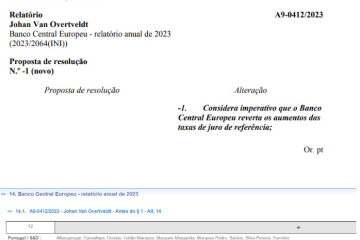 Num segundo momento, no relatório anual de 2023 do Banco Central Europeu, votado em Fevereiro de 2024, os deputados do PCP apresentaram, mais uma vez: «Consideram imperativo que o Banco Central Europeu reverta os aumentos das taxas de juro de referência». Se em Outubro o PSD votou contra, em Fevereiro o mesmo partido absteve-se. No final de contas, o efeito foi o mesmo, ou seja, o da não viabilização.