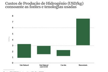 É colossal a distância entre os custos de produção a partir do gás natural (com e sem captação de CO2) e do carvão, e, por outro lado, a partir das fontes renováveis: no primeiro caso temos valores entre 1 e 3 USD/kg, e, no outro, entre 3 e 7 USD/kg.