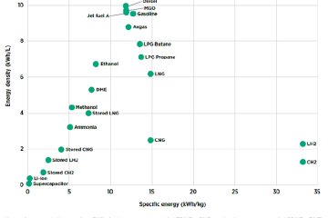 Já a amónia líquida tem quase oito vezes a densidade energética das baterias de iões de lítio, como se mostra na Figura 7, com as unidades expressas respectivamente em kWh/l e kWh/kg. Repare-se nas colossais diferenças que vão para os casos da gasolina, do diesel, do jet fuel e também para o butano, propano e gás natural liquefeito.