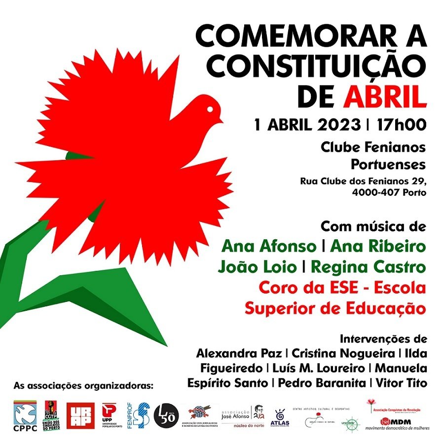 As associações e colectividades signatárias do documento «Defender os valores de Abril! Por ocasião do 47.º aniversário da Constituição da República Portuguesa» convidam toda a gente participar na iniciativa, no salão nobre do Clube Fenianos Portuenses, que definem como «uma afirmação de apoio e confiança nos valores de Abril, contra a guerra e na defesa da Paz».