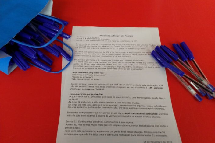 Em carta aberta dirigida ao ministro das Finanças, Mário Centeno, os trabalhadores da RTP com vínculo precário ofereceram 51 canetas que simbolizam cada processo que o ministro tem no seu gabinete, desde Março, para homologação. A assinatura do ministro é a última de que estes trabalhadores precisam para serem integrados e verem o seu vínculo de trabalho reconhecido com a RTP.